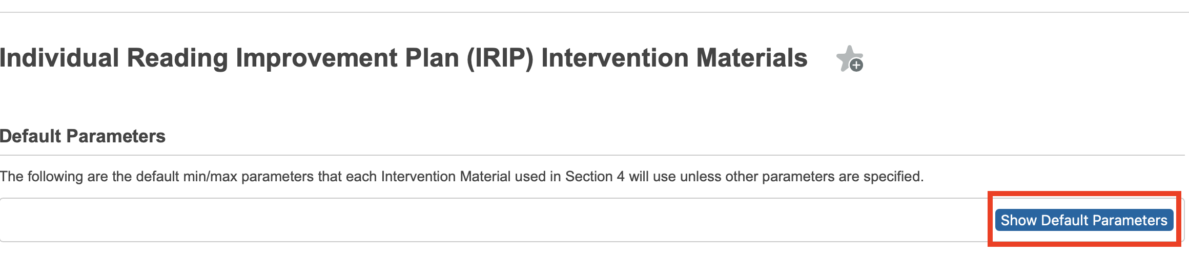 During implementation, a default set of parameters were defined for all interventions that populate the Days per Week, Minutes per Day, and Group Size drop-down menus. These default values can be editing by clicking the, "Show Default Parameters" button at the top of the page.