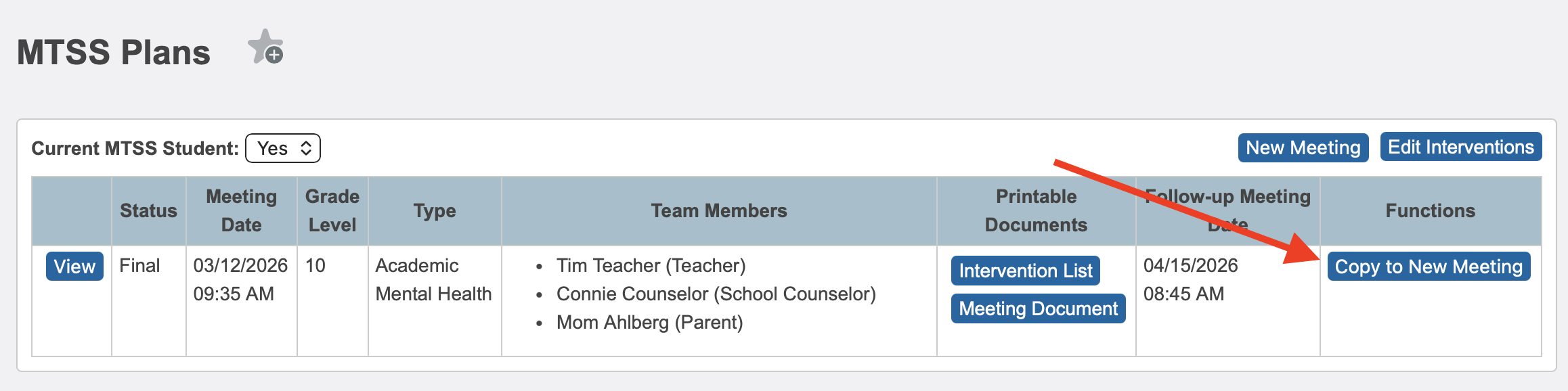 - Locate the prior meeting and click the "Copy to New Meeting" button